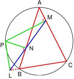 | Keywords: Pedal line illustration.png en wikipedia Maksim page en wikipedia Source code <source lang matlab > function main figure 1 ; clf; hold on; axis equal; axis off thickness 4; ball_rad 0 009; i sqrt -1 ; red 1 0 0; blue 0 0 1; black 0 0 0; green 0 0 9 0; fontsize 30; A exp i pi/2 ; B exp i 1 3 pi ; C exp i 1 8 pi ; P exp i 1 0 pi ; N return_perp A B P ; M return_perp C A P ; L return_perp B C P ; X 0 0 01 2 pi; plot cos X sin X 'color' black 'linewidth' thickness/2 ; plot circle plot sides plot real A B imag A B 'color' red 'linewidth' thickness ; plot real B C imag B C 'color' red 'linewidth' thickness ; plot real A C imag A C 'color' red 'linewidth' thickness ; line continuations plot real A M imag A M 'color' red 'linewidth' thickness 'linestyle' '--' ; plot real A N imag A N 'color' red 'linewidth' thickness 'linestyle' '--' ; plot real B N imag B N 'color' red 'linewidth' thickness 'linestyle' '--' ; plot real C L imag C L 'color' red 'linewidth' thickness 'linestyle' '--' ; plot real C M imag C M 'color' red 'linewidth' thickness 'linestyle' '--' ; plot heights plot real L P imag L P 'color' green 'linewidth' thickness ; plot real M P imag M P 'color' green 'linewidth' thickness ; plot real N P imag N P 'color' green 'linewidth' thickness ; plot pedal plot real L M imag L M 'color' blue 'linewidth' thickness ; plot real L N imag L N 'color' blue 'linewidth' thickness ; plot real M N imag M N 'color' blue 'linewidth' thickness ; ball A ball_rad red ; ball B ball_rad red ; ball C ball_rad red ; ball L ball_rad blue ; ball M ball_rad blue ; ball N ball_rad blue ; ball P ball_rad green ; ang_size 0 07; ang_thick 2; plot_angle P M A ang_size ang_thick red plot_angle P N B ang_size ang_thick red plot_angle P L C ang_size ang_thick red text_dist 0 005; place_text_smartly P fontsize 5 text_dist 'P' place_text_smartly A fontsize 2 text_dist 'A' place_text_smartly B fontsize 6 text_dist 'B' place_text_smartly C fontsize 7 text_dist 'C' place_text_smartly L fontsize 6 text_dist 'L' place_text_smartly M fontsize 1 text_dist 'M' place_text_smartly N fontsize 0 text_dist 'N' saveas gcf 'Pedal_line_illustration eps' 'psc2' function plot_angle a b c dist thickness color u b+dist a-b /abs a-b ; v b+dist c-b /abs c-b ; w u+v-b; plot real u w v imag u w v 'color' color 'linewidth' thickness ; function d return_perp a b c t fminbnd inline 'min abs sqrt -1 b-a /abs b-a - c-t b- 1-t a /abs c-t b- 1-t a abs sqrt -1 b-a /abs b-a + c-t b- 1-t a /abs c-t b- 1-t a ' 't' 'a' 'b' 'c' -0 5 2 a b c ; d t b+ 1-t a; function place_text_smartly z fs pos d tx p cos pi/4 +sqrt -1 sin pi/4 ; z z + p pos d fs; shiftx 0 0003; shifty 0 002; x real z ; y imag z ; H text x+shiftx fs y+shifty fs tx ; set H 'fontsize' fs 'HorizontalAlignment' 'c' 'VerticalAlignment' 'c' function ball z r color x real z ; y imag z ; Theta 0 0 1 2 pi; X r cos Theta +x; Y r sin Theta +y; H fill X Y color ; set H 'EdgeColor' color ; </source> 1 date/time username edit summary ---- 08 54 3 December 2005 en User Oleg Alexandrov <nowiki> update code </nowiki> ---- 05 45 3 December 2005 en User Oleg Alexandrov <nowiki> + source code </nowiki> ---- 05 45 3 December 2005 en User Oleg Alexandrov <nowiki></nowiki> Original upload log Legend cur this is the current file del delete this old version rev revert to this old version Click on date to download the file or see the image uploaded on that date del cur 08 54 3 December 2005 en User Oleg_Alexandrov Oleg Alexandrov en User_talk Oleg_Alexandrov Talk 427x453 39570 bytes Pedal element circle geometry Files by User Oleg Alexandrov from en wikipedia Images with Matlab source code math |