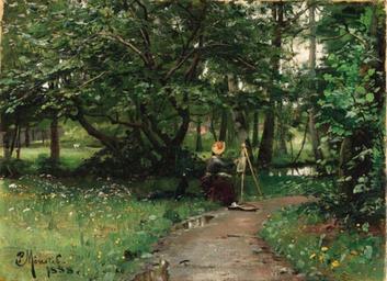 | Keywords: Peder Mork Monsted Painting off a Path Near a River.jpg Painting off a Path Near a River Signed and dated P Monsted /1888 Oil on canvas 29 3 x 39 4 cm Christie's online 309355 8045 418 1888 Creator Peder Mønsted PD-old-auto 1941 Peder Mønsted Female painters in art 1888 paintings Paintings of painters in plein air |