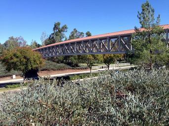 Keywords: pedestrian-bridge foliage shrubs bushes blue sky outside leaf landscape walk growth arc