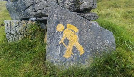 Keywords: pedestrian tourist sign symbol stencil graphics stone grass yellow stones