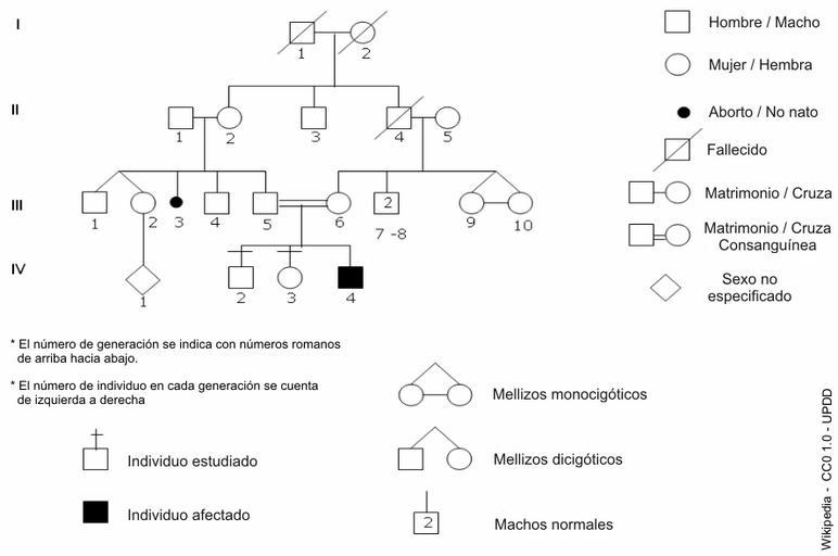 Keywords: PedigreeRep.png es Ejemplo de diagrama de pedigrí con sus símbolos asociados 2012-01-06 own J3D3 cc-zero Uploaded with UploadWizard Pedigree charts