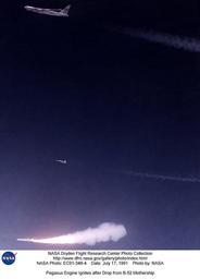 | Keywords: Pegasus Engine Ignites after Drop from B-52 Mothership DVIDS718121.jpg en Against the midnight blue of a high-altitude sky Orbital Sciences' Pegasus winged rocket booster ignites after being dropped from NASA's B-52 mothership on a July 1991 flight A NASA chase plane for the flight is also visible above the rocket and below the B-52 Pegasus is an air-launched space booster produced by Orbital Sciences Corporation and Hercules Aerospace Company initially; later Alliant Tech Systems to provide small satellite users with a cost-effective flexible and reliable method for placing payloads into low earth orbit Pegasus has been used to launch a number of satellites and the PHYSX experiment That experiment consisted of a smooth glove installed on the first-stage delta wing of the Pegasus The glove was used to gather data at speeds of up to Mach 8 and at altitudes approaching 200 000 feet The flight took place on October 22 1998 The PHYSX experiment focused on determining where boundary-layer transition occurs on the glove and on identifying the flow mechanism causing transition over the glove Data from this flight-research effort included temperature heat transfer pressure measurements airflow and trajectory reconstruction Hypersonic flight-research programs are an approach to validate design methods for hypersonic vehicles those that fly more than five times the speed of sound or Mach 5 Dryden Flight Research Center Edwards California provided overall management of the glove experiment glove design and buildup Dryden also was responsible for conducting the flight tests Langley Research Center Hampton Virginia was responsible for the design of the aerodynamic glove as well as development of sensor and instrumentation systems for the glove Other participating NASA centers included Ames Research Center Mountain View California; Goddard Space Flight Center Greenbelt Maryland; and Kennedy Space Center Florida Orbital Sciences Corporation Dulles Virginia is the manufacturer of the Pegasus vehicle while Vandenberg Air Force Base served as a pre-launch assembly facility for the launch that included the PHYSX experiment NASA used data from Pegasus launches to obtain considerable data on aerodynamics By conducting experiments in a piggyback mode on Pegasus some critical and secondary design and development issues were addressed at hypersonic speeds The vehicle was also used to develop hypersonic flight instrumentation and test techniques NASA's B-52 carrier-launch vehicle was used to get the Pegasus airborne during six launches from 1990 to 1994 Thereafter an Orbital Sciences L-1011 aircraft launched the Pegasus The Pegasus launch vehicle itself has a 400- to 600-pound payload capacity in a 61-cubic-foot payload space at the front of the vehicle The vehicle is capable of placing a payload into low earth orbit This vehicle is 49 feet long and 50 inches in diameter It has a wing span of 22 feet There is also a Pegasus XL vehicle that was introduced in 1994 Dryden has never launched one of these vehicles but they have greater thrust and are 56 feet long NASA Identifier NIX-EC91-348-4 2009-09-23 Glenn Research Center https //www dvidshub net/image/718121 718121 2012-10-10 18 28 WASHINGTON DC US PD-USGov Vandenberg Air Force Base Langley Research Center Images from DoD uploaded by Fæ |