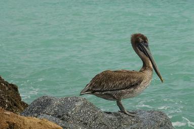 Keywords: pelican beach ocean gulf feathers nature outdoors beak blue rocks shore seashore waves water bird
