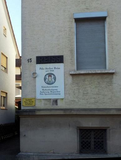 | Keywords: Pelz-Atelier Reiss, Reutlingen, Seestraße 15, 2015.jpg Reutlingen Seestraße 15 Deutschland Pelzatelier Adolf Reiss seit 1966 Kürschnermeister Maßanfertigung - Änderung -Reparatur - Pelz-Spezialreinigung photo 2015-11-02 Kürschner <span class signature-talk ></span> 16 57 2 November 2015 UTC Kürschner Furriers in Reutlingen Reiss Seestraße Reutlingen Coats of arms of furriers | ||||