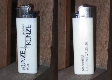 | Keywords: Pelze Kunze, Mannheim, Werbegeschenk Feuerzeug.jpg Feuerzeug Werbegeschenk der Firma Kunze Pelze Mannheim Alter unbekannt vor 2000 Collection Kuhn 2011-11-24 Kürschner <span class signature-talk >talk</span> 08 09 24 November 2011 UTC Kürschner PD-textlogo Pelzhaus Kunze Furrier's collection Kuhn Disposable lighters Fur advertising |