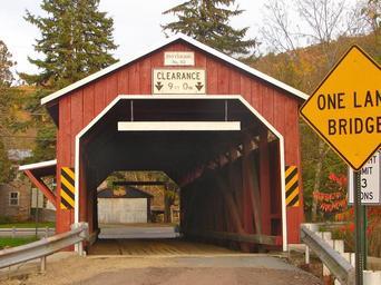 Keywords: pennsylvania covered bridge wood wooden village buildings architecture sky clouds trees nature outside road old historical landmark fall autumn scenic country countryside beautiful
