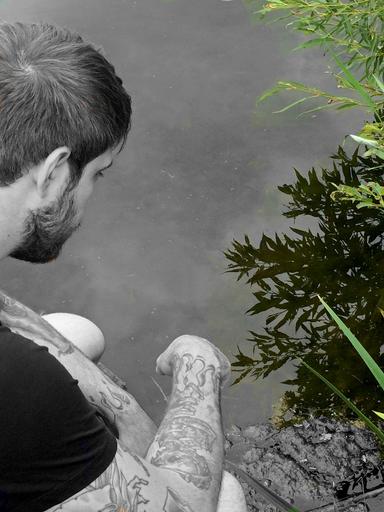 Keywords: pensive nature lake man pond sitting alone solitude tatoos hand