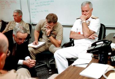 | Keywords: Pentagon on 9.11 - meeting2.jpg 010911-N-5636P-001 Sep 11 2001-- The Honorable Gordon England Secretary of the Navy left Rear Admiral Christopher Weaver center Commandant Naval District Washington and Vice Admiral Timothy Keating right Deputy Chief of Naval Operations for Plans Policy and Operations lean closer to the phone as the first damage assessment reports from the Pentagon come in just hours after the terrorist attack on Sep 11 2001 The Secretary was in Texas at the time of the attack and immediately returned to Washington where he was taken to an undisclosed location to be briefed 010911-N-5636P-001 Navy http //www navy mil/management/photodb/photos/010911-N-5636P-001 jpg 2001-09-11 U S Navy Photo by Chief Photographer's Mate Dolores L Parlato <gallery>Image Pentagon on 9 11 - meeting1 jpg</gallery> PD-USGov-Military-Navy original upload log wikitable date/time username resolution size edit summary ---- 13 53 25 May 2007 User Nickel Chromo 2 100×1 433 1 5 MB <nowiki> <span class comment > 010911-N-5636P-001 Sep 11 2001-- The Honorable Gordon England Secretary of the Navy left Rear Admiral Christopher Weaver center Commandant Naval District Washington and Vice Admiral Timothy Keating right Deputy Chief </span></nowiki> ImageNote 1 202 420 344 433 2100 1433 2 SECNAV Gordon Richard England ImageNoteEnd 1 The Pentagon on 9/11 2001 photographs Photographs of sitting men Emotions Brainstorming Resting arms People of the United States in 2001 Gordon R England Military people in 2001 Timothy J Keating Male soldiers Sitting with hand on head September 2001 photographs |