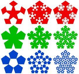 | Keywords: Pentagonal-fractals-3.svg Three iterations of three separate fractal series each of which starts from a regular pentagon On top red Fractal shapes derived by iteratively placing five smaller pentagons in inverse color along the edges of a pentagon inside it In the middle green fractal shapes derived by iteratively replacing a pentagon with six smaller pentagons one central five peripheral At bottom blue fractal shapes derived by iteratively replacing a pentagon with six smaller pentagons where the five peripheral smaller pentagons are the same color while the central smaller pentagon is inverse color For a variation on the top red fractal see File Pentagonal-fractal-example svg For another depiction of the middle green fractal see File Penta plexity png Self-made graphic converted from a version of the following three-page vector PostScript source code <pre> 306 396 translate 4 dup scale/D 52 57315251 def/plr dup 3 2 roll 72 mul 90 add dup 3 1 roll cos mul 3 1 roll sin mul def/P 4 D plr 3 D plr 2 D plr 1 D plr 0 D plr moveto 4 lineto repeat closepath fill def P gsave 1 setgray 5 gsave 2 5 D 1 7508 div plr translate 294 dup scale P 0 setgray 5 gsave 2 5 D 1 7508 div plr translate 294 dup scale P 1 setgray 5 gsave 2 5 D 1 7508 div plr translate 294 dup scale P grestore 72 rotate repeat grestore 72 rotate repeat grestore 72 rotate repeat grestore showpage 306 396 translate 0 3068125350855 dup scale /A 38 196601125 def/B 61 803398875 def/C 161 803398875 def/P 4 5 A plr 3 5 A plr 2 5 A plr 1 5 A plr 0 5 A plr moveto 4 lineto repeat closepath fill def/Q 4 A plr 3 A plr 2 A plr 1 A plr 0 A plr moveto 4 lineto repeat closepath fill def 0 1 4 gsave 423 60679775 plr translate 0 1 4 gsave C plr translate 0 1 4 gsave B plr translate Q grestore P for grestore for 0 5 1 4 5 gsave B plr translate P grestore Q for grestore for 0 1 4 gsave B plr translate Q grestore for P 0 5 1 4 5 gsave C plr translate 0 5 1 4 5 gsave B plr translate P grestore for Q grestore for showpage 306 396 translate 0 3068125350855 dup scale 0 1 4 gsave 423 60679775 plr translate 0 1 4 gsave C plr translate 0 1 4 gsave B plr translate Q grestore for grestore for gsave 4 5 100 plr 3 5 100 plr 2 5 100 plr 1 5 100 plr 0 5 100 plr moveto 4 lineto repeat closepath fill grestore 0 5 1 4 5 gsave B plr translate 1 setgray P grestore for grestore for gsave/X 261 803398875 def 4 5 X plr 3 5 X plr 2 5 X plr 1 5 X plr 0 5 X plr moveto 4 lineto repeat closepath fill grestore 1 setgray 0 5 1 4 5 gsave C plr translate 0 5 1 4 5 gsave B plr translate P grestore for grestore for gsave 1 setgray 4 100 plr 3 100 plr 2 100 plr 1 100 plr 0 100 plr moveto 4 lineto repeat closepath fill grestore 0 setgray 0 1 4 gsave B plr translate Q grestore for showpage EOF</pre> 2009 AnonMoos Regular pentagons Pentagonal fractals Koch snowflakes Images with PostScript source code Order 4 |