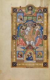 | Keywords: Pentecost - Google Art Project.jpg A full-page miniature illustrates the Mass for Pentecost At the top of the page the Alpha and Omega the first and last letters of the Greek alphabet flank Christ They stand as symbols of God's presence at the beginning and end of time In the center section five apostles hold books Bust-length figures in niches above and below gaze up at Christ The texts below them relate thematically to the descent of the Holy Spirit which occurred at Pentecost This unusual representation of Pentecost does not show the descent of the Holy Spirit upon the apostles the most common subject Instead it depicts Peter identifiable by his short gray hair and beard surrounded by the apostles during the sermon he gave on Pentecost None 430703 Unknown /collection/the-j-paul-getty-museum/artwork/pentecost-unknown/6893497/ Unknown illuminator /collection/the-j-paul-getty-museum/ The J Paul Getty Museum 343005 http //www getty edu/museum 3/13/2012 12 07 58 AM /collection/the-j-paul-getty-museum/artwork/pentecost-unknown/6893497/ 1170 probably 1170s Solomon king of Israel Christ Saint Luke Saint Peter Joel Solomon Tempera colors gold leaf silver leaf and ink on parchment 282 6893497 True 1179 3/25/2012 3 09 09 PM lido getty edu-gm-obj112637 http //www getty edu/art/gettyguide/artObjectDetails artobj 112637 http //www getty edu/legal/copyright html Folio 1170 1180 Hildesheim Germany Creation w189 x h282 cm probably 1170s False 0 630859375 Part pentecost-unknown Pentecost p 189 Tempera colors gold leaf silver leaf and ink on parchment Solomon king of Israel Christ Saint Luke Saint Peter Joel Solomon http //www getty edu/legal/copyright html special url_id MAFkjDKiSiqOxA PD-old-100 Google Art Project works by unknown artist Miniatures of Pentecost MS 64 Getty museum - Stammheim Missal Omega letter |