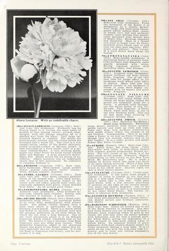 | Keywords: Peonies for pleasure (16208627120).jpg Alsace Lorraine With an indefinable charm <br> 163 ALSACE LORRAINE Lemoine 1906 Semi- <br> rose type; late midseason Evidently has La <br> France blood in it having the same habit of <br> growth of that famous variety; growth erect <br> upright with the foliage standing off in a <br> marked way from the plant Very large im- <br> bricated flowers in clusters The petals are <br> pronouncedly pointed and the center petals are <br> arranged like a water lily The color is a rich <br> creamy-white center of the flower delicately <br> tinted brownish-yellow or Havana brown; is <br> best described as a fried butter color of a pe- <br> culiar reddish-brown A very striking shade <br> unlike any other Peony we know except Claude <br> Gelee and Solange A most attractive flower <br> Extra fine Easily scores the six points of ex- <br> cellence Alsace Lorraine has an indefinable <br> charm that is very pronounced No collection <br> is complete without it <br> 281 AMAZOIVE Lemoine 1S99 Rose type; <br> early midseason Well formed Large perfect <br> flower guards rosy-white center creamy- <br> white flecked crimson; fragrant <br> 98 ANDRE LAURIES Crousse 1881 Rose <br> type; very late Very dense compact globular <br> bloom of the largest size Color dark tyrian- <br> rose or solferino-red shading deeper in the <br> center with red reflex; guards same color oc- <br> casionally splashed with green center mottled <br> with white An all around good Peony <br> 37 ANEMONEFLORA RUBRA Guerin 1854 <br> Anemone type; midseason Deep brilliant ty- <br> rian-rose carpels dark crimson Strong tall <br> free bloomer in clusters A good variety <br> 540 ARCHIE BRAND Brand 1913 Bomb type; <br> midseason prize Peony An enormous flower <br> of an even deep seashell-pink with silvery <br> border The petals closely massed form a <br> solid head which is surrounded by broad <br> drooping guard petals There is a charm about <br> this flower in its even soft uniform color and <br> the peculiar perfection of its form which at- <br> tracts the eye from a long distance One of <br> the chief attractions about it is its delicate <br> fragrance which closely resembles that of the <br> Rose We believe it has a stronger true Rose <br> fragrance than any other pink variety This <br> delightful fragrance added to the charming <br> beauty and grace of the flower makes this va- <br> riety especially fine for cut blossoms It rivals <br> the Rose in fragrance and beauty and far sur- <br> passes it in size <br> 102 ASA GRAY Crousse 1SS6 <br> Semi-rose type; midseason Prom <br> the formation of the flower it is <br> designated as a double decker <br> Very large full imbricated bloom; <br> guard petals salmon-flesh center <br> of bloom very full and perfectly <br> formed; color delicate lilac plente - <br> ously sprinkled with minute dots <br> of deeper lilac Striking imposing <br> and beautiful Here is a flower <br> you want to linger over No Peony <br> produces more bloom year in and <br> year out than does Asa Grav Fra- <br> grant and distinct This variety <br> at a local flower show swept the <br> boards <br> 84 A TROSAX GUINEA Calot <br> 1850 Semi-double; midseason A <br> marvelous flower of globular form <br> Color brilliant rosy-magenta outer <br> guards streaked with white <br> Strong vigorous grower with <br> spreading habit; free bloomer <br> 23 AUGUSTE LEMOND2R Calot <br> 1865 Anemone type; midseason <br> Superb brilliant red with velvety <br> finish; fragrant One of the very- <br> best reds for hedge effect or for <br> landscape work where color effect <br> is desired Many who saw this <br> superb variety in our nurseries in <br> bloom in June were highly im- <br> pressed with its beauty and great <br> value Fragrant <br> 170 A UGUSTE VILLAUME <br> Crousse 1895 Rose type; late <br> Enormous full round bloom with <br> closely set large petals; indeed the <br> petals are unusually large for a <br> Peony A uniform color through- <br> out the entire flower of rich vio- <br> let-rose Very fragrant A Peony <br> which when well done is one of <br> the very fetching sorts This and <br> all late sorts need watering to <br> properly develop them <br> 22S AUGUSTIN d'HOUR Calot <br> 1867 Syn Marechal MacMahon <br> Bomb type; midseason Extremely <br> large showy perfectly built bloom; primary <br> petals narrow and built up close and high <br> Color very deep rich brilliant solferino-red <br> with slight silvery reflex; the largest of all <br> red Peonies Indispensable This is as high <br> class a Peony in its way as Felix Crousse al- <br> though they are entirely distinct and in no <br> way conflict It is a taller grower and larger <br> flower than Felix Crousse <br> 17 AURORE Dessert 1904 Semi-rose type; <br> late Extra large flat loose bloom Color <br> lilac-white with collar of milk-white flecked <br> with crimson guards prominently flecked car- <br> mine The very center of the bloom is of the <br> same shade as the guards Fragrant Superb <br> Commenting on this variety at the New York <br> Show Mr Bonnewitz said Mr G made a <br> display of Aurore which just made you think <br> of an early spring morning When I first saw <br> it I involuntarily said 'Sunrise ' and a learned <br> friend at my elbow said 'Exactly right for <br> that is what Aurore means ' <br> 132 AVALANCHE Crousse 18S6 Crown type; <br> late midseason It has taken some people a <br> number of years to tumble to the fact that <br> this is a first-class Peony This magnificent <br> variety opens like a rose bud Color pure <br> snow-white with a few delicate pencilings <br> of carmine on the edge of the central petals; <br> very waxy and chaste; fragrant One of the <br> most superb Peonies in fact it is unsurpassed <br> by any other white Peony The variety Al- <br> batre is identical with Avalanche <br> 574 AVIATEUR REVMOND Dessert 1915 A <br> very large and beautiful flower; bright cherry- <br> red shaded garnet and brilliant amarant