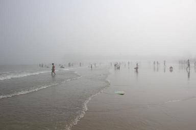 Keywords: people beach foggy dull person water ocean sea murky hazy weather swimming vacation activity
