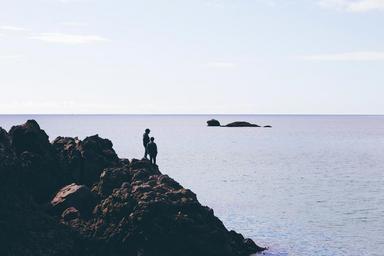 Keywords: people hiking trekking adventure coast rocks cliff ocean sea horizon water sky nature landscape sunshine blue