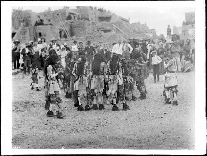 Keywords: People watching the throwing of snakes into the sacred meal at Hopi Snake Dance Ceremony at pueblo of Oraibi, Arizona, ca.1898 (CHS-4657).jpg en <br> People watching the throwing of snakes into the sacred meal at Hopi Snake Dance Ceremony at pueblo of Oraibi Arizona ca 1898 Photograph of spectators watching the throwing of snakes into the sacred meal at Hopi Snake Dance Ceremony at pueblo of Oraibi Arizona ca 1898 The dozen or so dancers stand in a rough circle at center They wear highly decorated skirts animal tails feathers necklaces bracelets and leggings Their chests arms and faces are painted white A large group of mostly white spectators stand in the background before the dwellings of the pueblo visible behind them Call number CHS-4657 Legacy record ID chs-m16980; USC-1-1-1-13888 Photographer James George Wharton Filename CHS-4657 Coverage date circa 1898 Part of collection California Historical Society Collection 1860-1960 Type images Geographic subject city or populated place Oraibi Repository name USC Libraries Special Collections Accession number 4657 Microfiche number 1-170- Archival file chs_Volume97/CHS-4657 tiff Part of subcollection Title Insurance and Trust and C C Pierce Photography Collection 1860-1960 Repository address Doheny Memorial Library Los Angeles CA 90089-0189 Geographic subject country USA Format aacr2 3 photographs glass photonegative photoprints b w ; 17 x 22 cm 21 x 26 cm Rights Digitally reproduced by the USC Digital Library; From the California Historical Society Collection at the University of Southern California Subject adlf tribal areas Project USC Repository email specol usc edu Identifying number unidentified no James-344 Contributing entity California Historical Society Date created circa 1898 Publisher of the digital version University of Southern California Libraries Format aat photographic prints; photographs Geographic subject state Arizona Subject file heading Indians -- Hopi -- Snake Dance Geographic coordinates -110 639717 35 876389; -110 639442 35 876389; -110 639442 35 874722; -110 639717 35 874722; -110 639717 35 876389 Format glass plate negatives Access conditions Send requests to address or e-mail given Phone 213 821-2366; fax 213 740-2343 Geographic subject county Navajo Subject lcsh Indians of North America; Hopi Indians; Rites and ceremonies Subject Hopi Snake Dance Ceremony circa 1898 date created George Wharton James 1858 1923 http //digitallibrary usc edu/cdm/ref/collection/p15799coll65/id/16899 PD-old-70-1923 Images from USC Digital Library uploaded by Fæ Photographs by George Wharton James California Historical Society Collection 1860-1960 Glass plate negatives Hopi people |