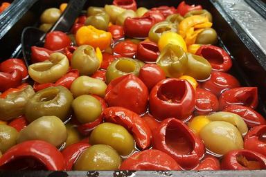Keywords: pepperazzi tri‑color pepperazzi peppers peruvian antipasto sweet spicy savory toppings condiment food eat edible meal salad topping