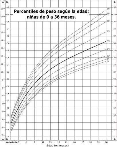 | Keywords: Percentiles peso bebes niñas.svg en Weight-for-age Percentils Girls birth to 36 months de Perzentilenkurve für das Gewicht bezogen auf das Alter für Mädchen von der Geburt bis zum Alter von 36 Monaten es Percentiles de peso según la edad niñas de 0 a 36 meses Weight-for-age-girls svg 2009-04-02 17 46 UTC Weight-for-age-girls svg derivative work FischX <span class signature-talk >talk</span> Weight-for-age-girls jpg National Center for Health Statistic 2000 derivative work Tartaglia <span class signature-talk >talk</span> Percentiles peso bebes niñas png Ejemplo de uso de una tabla de percentiles svg Traducción al español Tartaglia Weight-for-age-girls svg PD-USGov PD-USGov-HHS-CDC original upload log This image is a derivative work of the following images File Weight-for-age-girls svg licensed with PD-USGov PD-USGov-HHS-CDC 2008-11-14T12 29 45Z FischX 632x796 71864 Bytes <nowiki> Percentiles peso bebes niñas png Ejemplo de uso de una tabla de percentiles svg </nowiki> 2008-11-14T12 07 39Z FischX 632x796 68548 Bytes <nowiki> Percentiles peso bebes niñas png Ejemplo de uso de una tabla de percentiles svg </nowiki> 2008-11-14T11 42 10Z FischX 632x796 101290 Bytes <nowiki> Percentiles peso bebes niñas png Ejemplo de uso de una tabla de percentiles svg </nowiki> 2008-11-14T11 34 58Z FischX 765x990 101943 Bytes <nowiki> en Weight-for-age Percentils Girls birth to 36 months de Perzentilenkurve für das Gewicht bezogen auf das Alter für Mädchen von der Geburt bis zum Alter von 36 Monaten </nowiki> Uploaded with derivativeFX Paediatrics Girls Childbirth graphs Childhood |