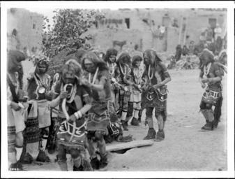 | Keywords: Performing Hopi Snake Dance Ceremony at pueblo of Oraibi, Arizona, 1898 (CHS-4660).jpg en <br> Performing Hopi Snake Dance Ceremony at pueblo of Oraibi Arizona 1898 Photograph of a dozen or so Hopi men performing the Hopi Snake Dance Ceremony at the pueblo of Oraibi Arizona 1898 They can be seen dancing in a vague line wearing highly decorated skirts moccasins feathers necklaces bracelets Their chests arms and faces are painted white The priest in the foreground holds a snake in his mouth A small group of spectators watches from near multi-tiered dwellings of the pueblo in the background Call number CHS-4660 Legacy record ID chs-m16983; USC-1-1-1-13888 Photographer James George Wharton Filename CHS-4660 Coverage date 1898 Part of collection California Historical Society Collection 1860-1960 Type images Geographic subject city or populated place Oraibi Repository name USC Libraries Special Collections Accession number 4660 Microfiche number 1-170- Archival file chs_Volume97/CHS-4660 tiff Part of subcollection Title Insurance and Trust and C C Pierce Photography Collection 1860-1960 Repository address Doheny Memorial Library Los Angeles CA 90089-0189 Geographic subject country USA Format aacr2 5 photographs glass photonegative photonegative photoprints b w ; 17 x 22 cm 10 x 13 cm 21 x 26 cm Rights Digitally reproduced by the USC Digital Library; From the California Historical Society Collection at the University of Southern California Subject adlf tribal areas Project USC Repository email specol usc edu Identifying number plate no James-347 Contributing entity California Historical Society Date created 1898 Publisher of the digital version University of Southern California Libraries Format aat negatives photographic ; photographic prints; photographs Geographic subject state Arizona Subject file heading Indians -- Hopi -- Snake Dance Geographic coordinates -110 639717 35 876389; -110 639442 35 876389; -110 639442 35 874722; -110 639717 35 874722; -110 639717 35 876389 Format glass plate negatives Access conditions Send requests to address or e-mail given Phone 213 821-2366; fax 213 740-2343 Geographic subject county Navajo Subject lcsh Indians of North America; Hopi Indians; Rites and ceremonies; Men Subject Hopi Indians; Hopi Snake Dance 1898 date created George Wharton James 1858 1923 http //digitallibrary usc edu/cdm/ref/collection/p15799coll65/id/16902 PD-old-70-1923 Images from USC Digital Library uploaded by Fæ Photographs by George Wharton James California Historical Society Collection 1860-1960 Glass plate negatives Hopi people |