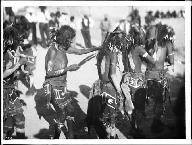 Keywords: Performing Hopi Snake Dance at pueblo of Oraibi, Arizona, ca.1896 (CHS-4647).jpg en <br> Performing Hopi Snake Dance at pueblo of Oraibi Arizona ca 1896 Photograph of Hopi men performing the Hopi Snake Dance at the pueblo of Oraibi Arizona ca 1896 The six dancers wear highly painted kilts feathers and fox tails and are facing to the right Their arms and chests are decorated with white paint or dried mud One man at the far left holds a snake in his mouth A small group of spectators are visible in the background Call number CHS-4647 Legacy record ID chs-m16971; USC-1-1-1-13888 Photographer James George Wharton Filename CHS-4647 Coverage date circa 1896 Part of collection California Historical Society Collection 1860-1960 Type images Geographic subject city or populated place Oraibi Repository name USC Libraries Special Collections Accession number 4647 Microfiche number 1-170- Archival file chs_Volume97/CHS-4647 tiff Part of subcollection Title Insurance and Trust and C C Pierce Photography Collection 1860-1960 Repository address Doheny Memorial Library Los Angeles CA 90089-0189 Geographic subject country USA Format aacr2 3 photographs glass photonegative photoprints b w ; 17 x 22 cm 21 x 26 cm Rights Digitally reproduced by the USC Digital Library; From the California Historical Society Collection at the University of Southern California Subject adlf tribal areas Project USC Repository email specol usc edu Identifying number unidentified no James-309 Contributing entity California Historical Society Date created circa 1896 Publisher of the digital version University of Southern California Libraries Format aat photographic prints; photographs Geographic subject state Arizona Subject file heading Indians -- Hopi -- Snake Dance Geographic coordinates -110 639717 35 876389; -110 639442 35 876389; -110 639442 35 874722; -110 639717 35 874722; -110 639717 35 876389 Format glass plate negatives Access conditions Send requests to address or e-mail given Phone 213 821-2366; fax 213 740-2343 Geographic subject county Navajo Subject lcsh Indians of North America; Hopi Indians; Rites and ceremonies; Men Subject Hopi Snake Dance circa 1896 date created George Wharton James 1858 1923 http //digitallibrary usc edu/cdm/ref/collection/p15799coll65/id/16890 PD-old-70-1923 Images from USC Digital Library uploaded by Fæ Photographs by George Wharton James California Historical Society Collection 1860-1960 Glass plate negatives Hopi people |