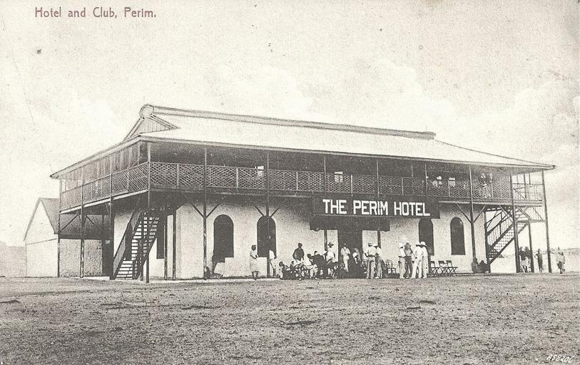 Keywords: Perim Hotel and Club.jpg en The Perim Hotel the only hotel Perim ever had during the British period was initially called the Grand Hotel when it was built before 1888 then The Oriental and finally The Perim Hotel Perim's cricket grounds were next to the hotel and most of the people shown on this picture from circa 1910 are probably cricket players Accommodations tended to be very basic on Perim Island where all activities centered on coaling operations until 1936 The hotel belonged to the Perim Coal Company Contemporary real photo postcard 2014-04-05 17 35 52 Delcampe online auction Unknown postcard published c 1910 PD-old-70 Uploaded with UploadWizard Colony of Aden Perim Island |
