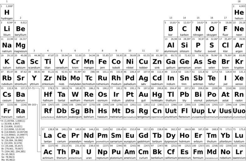 Keywords: Periodic table simple no bw.svg en Simple periodic table with localized element names and standard atomic weights IUPAC 2009 Temporarily converted to paths till fixing Wikipedia ™s font problem with DejaVu Sans Condensed but also the previous version of this image works correctly outside of Wikipedia 2013-11-04 01 25 51 own LĂĄszlĂł NĂ©meth Source code ; Created in LibreOffice 4 1 2 with this LibreLogo program ; Usage Put this code into an English language document in LibO Writer ; fix one program line for older LibreOffice versions see FIXME in the code ; and click on the Start icon of the View»Toolbars»Logo toolbar ; NEED INTERNET CONNECTION TO RUN THIS PROGRAM table data downloaded from Wikipedia lang input Language af ca cs de el en et fi fr it nl pt pt-br bw int input Color 0 COLORED 1 BLACK/WHITE ; Source pages http //www wikidata org/wiki/Q13584100 ; data fields Wikipedia page column of element names sorting by this column optional sources ru D0 A1 D0 BF D0 B8 D1 81 D0 BE D0 BA_ D1 85 D0 B8 D0 BC D0 B8 D1 87 D0 B5 D1 81 D0 BA D0 B8 D1 85_ D1 8D D0 BB D0 B5 D0 BC D0 B5 D0 BD D1 82 D0 BE D0 B2 2 fr Liste_des_ C3 A9l C3 A9ments_chimiques 2 de Liste_der_chemischen_Elemente 1 3 el CE 9A CE B1 CF 84 CE AC CE BB CE BF CE B3 CE BF CF 82_ CF 87 CE B7 CE BC CE B9 CE BA CF 8E CE BD_ CF 83 CF 84 CE BF CE B9 CF 87 CE B5 CE AF CF 89 CE BD_ CE BA CE B1 CF 84 CE AC_ CE B1 CF 84 CE BF CE BC CE B9 CE BA CF 8C_ CE B1 CF 81 CE B9 CE B8 CE BC CF 8C 2 it Elementi_per_numero_atomico 2 hu K C3 A9miai_elemek_list C3 A1ja 3 ca Llista_d 27elements_per_nombre_at C3 B2mic 2 no Grunnstoffliste 2 cs Seznam_chemick C3 BDch_prvk C5 AF 3 uk D0 A1 D0 BF D0 B8 D1 81 D0 BE D0 BA_ D1 85 D1 96 D0 BC D1 96 D1 87 D0 BD D0 B8 D1 85_ D0 B5 D0 BB D0 B5 D0 BC D0 B5 D0 BD D1 82 D1 96 D0 B2 2 et Keemiliste_elementide_loend 2 nl Lijst_van_elementen 2 3 fi Luettelo_alkuaineista 2 3 eo Listo_de_kemiaj_elementoj_la C5 AD_atomnumero 3 pt Anexo Lista_de_elementos_qu C3 ADmicos 2 sv Lista_ C3 B6ver_grund C3 A4mnen 2 3 af Lys_van_elemente_volgens_atoomgetal 2 pl Pierwiastki_chemiczne_wed C5 82ug_liczby_atomowej 2 IF lang en langpage sourceslang 20 langfield sourceslang 21 ; column with element names on the Wikipedia page IF COUNT sourceslang 2 3 langsort sourceslang 22 langsort 0 GLOBAL annotation posx posy size font font2 lang font DejaVu Sans font2 DejaVu Sans Condensed ; Wikimedia has got problem with it convert the result to path in Inkscape if needed posx 30 posy 40 size 42 ; load and process element data from Wikipedia embedded Python exec import urllib request exec data urllib request urlopen http //en wikipedia org/w/index php action raw title List_of_elements readlines exec table for j in i decode utf-8 replace style \\\ background-color 0x replace \\\ split for i in data if re match \ \d+ \ \ i decode utf-8 ; load and process other language data IF lang en exec data urllib request urlopen http // s wikipedia org/w/index php action raw title s readlines lang 2 langpage IF langsort > 0 exec langtable i decode utf-8 split d-1 split 0 split -1 strip \t split 0 split < 0 split 0 strip \t split -1 int i decode utf-8 split d-1 strip \t for i in data if re match \ \t \d+ \t \ \ i decode utf-8 langfield langsort exec import operator exec langtable sort key operator itemgetter 1 exec langtable i0 for i in langtable IF lang no exec data i decode utf-8 replace replace encode utf-8 for i in data IF lang pl exec data i decode utf-8 replace 0 replace “ replace \x27 encode utf-8 for i in data exec langtable i decode utf-8 replace <td> replace </td> split d split / 0 strip split -1 split 0 for i in data if re match <tr><td> \ \d+ </td> \ \ i decode utf-8 langfield-1 langtable ; a few fixes table793 Mercury ; instead of Mercury element table117 24 31 ; Mg table257 55 85 ; Fe table637 157 3 ; Gd ; add missing positions TO the table FOR i IN RANGE 56 71 tablei5 i “ 56 “ 4 tablei6 8 5 FOR i IN RANGE 88 103 tablei5 i “ 88 “ 4 tablei6 9 5 IF lang pt OR lang pt-br FOR i in 1 HidrogĂ©nio/HidrogĂȘnio 7 Azoto/NitrogĂȘnio 8 OxigĂ©nio/OxigĂȘnio 10 NĂ©on/NeĂŽnio 18 Árgon/ArgĂŽnio 33 ArsĂ©nio/ArsĂȘnio 34 SelĂ©nio/SelĂȘnio 36 CrĂ­pton/CriptĂŽnio 40 ZircĂłni/ZircĂŽni 42 MolibdĂ©nio/MolibdĂȘnio 44 RutĂ©nio/RutĂȘnio 51 AntimĂłnio/AntimĂŽnio 54 XĂ©non/XenĂŽnio 74 TungstĂ©nio/TungstĂȘnio 75 RĂ©nio/RĂȘnio 86 RĂĄdon/RadĂŽnio 93 NeptĂșnio/NetĂșnio 94 PlutĂłnio/PlutĂŽnio 97 BerkĂ©lio/BerquĂ©lio 99 EinstĂ©nio/EinstĂȘnio 103 LaurĂȘncio/LawrĂȘncio IF lang pt-br ptbr 1 ptbr 0 langtablei0-1 i1 split / ptbr ; helper functions TO width_of_last_object OUTPUT _ drawpage getByIndex _ drawpage getCount -1 getSize Width / 100 __MM_TO_PT__; IN PT END ; FIXME remove the space before the END TO delete_last_object _ drawpage remove _ drawpage getByIndex _ drawpage getCount -1 END TO element size d l18n bw PENUP POSITION posx + INT d5 size posy + FLOAT d6 size 1 2 HEADING 0 ; show group number IF INT d0 IN 1 2 4 5 6 7 8 9 21 22 23 24 25 26 27 28 29 30 IF lang in af ca en eo no pl pt pt-br sv FORWARD size/2 + size/5 LABEL 0 1 d5 FORWARD size/2 + size/5 LABEL 0 4 5 d5 groupname 1 I ŻA 2 II ŻA 3 III ŻB 4 IV ŻB 5 V ŻB 6 VI ŻB 7 VII ŻB 8 •­ ” ” ” 9 VIII ŻB 10 ” ” ” •ź 11 I ŻB 12 II ŻB 13 III ŻA 14 IV ŻA 15 V ŻA 16 VI ŻA 17 VII ŻA 18 VIII ŻA d5 IF lang not in hu groupname SUB groupname FONTSIZE 10 LABEL 0 1 groupname BACK size/2 + size/5 IF bw FILLCOLOR WHITE FILLCOLOR INT d1 PENDOWN RECTANGLE size size 1 2 PENUP IF M IN d2 OR m IN d2 OR 2 < COUNT d2 FONTFAMILY font2 FONTFAMILY font FONTWEIGHT BOLD FONTSIZE size/2 1 TEXT d2 FONTWEIGHT UPRIGHT FONTFAMILY font BACK size 1 2/2-size/20 fontsiz 5 6 FONTSIZE size/fontsiz IF l18n name l18nINT d0 -1 name d3 if lang de name name lower LABEL 0 1 name fontdescratio 492/2048 ; DejaVu Sans Condensed IF width_of_last_object > size 0 95 delete_last_object FONTFAMILY font2 LABEL 0 1 name width width_of_last_obj