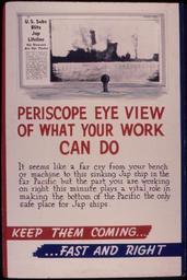 | Keywords: Periscope eye view of what your work can do. Keep them coming... fast and right^ - NARA - 534780.tif Scope and content General notes 534780 Local identifier 179-WP-929 Office for Emergency Management War Production Board 01/1942 - 11/03/1945 Still Picture Records Section Special Media Archives Services Division NWCS-S National Archives at College Park 8601 Adelphi Road College Park MD 20740-6001 other date circa 1942 1943 Record group Record Group 179 Records of the War Production Board 1918 - 1947 Record group ARC 508 War Production Board compiled 1942 - 1943 Series ARC 533858 File unit File unit ARC Variant control numbers NAIL Control Number NWDNS-179-WP-929 yes Other versions <gallery> File Periscope_eye_view_of_what_your_work_can_do _Keep_them_coming _fast_and_right _-_NARA_-_534780 tif tif File Periscope_eye_view_of_what_your_work_can_do _Keep_them_coming _fast_and_right _-_NARA_-_534780 jpg jpg </gallery> NARA-cooperation PD-USGov World War II posters from the United States NARA TIF images with categorized JPGs |