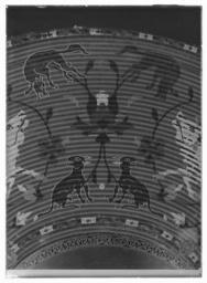 | Keywords: Persisk sköld, kalkan, 1500-talets slut. Förmodat krigsbyte från Prag 1648 - Livrustkammaren - 60812-negative.tif Rund sköld uppbyggd av 42 stycken synliga ringformade vidjor av fikonträ lindade och broderade med silkestråd i rött grönt gult svart grått och vitt <br/>All kanttråd fäst i längs fiberriktningen rakt dragna skåror i träet Kanttråden till alla figurer och ornament fästad på detta sätt möjligen även den röda bottentråden <br/>Yttersta ringen med dekor av parvis oregelbundna ornament i rött mellan dessa rektangel i svart med i mitten likarmat kors i vitt Detta mot botten i gult Nästa ring helt i grönt Därefter större fält med djur över slingrande växter Fyra större grupper av oxe i svart med vita horn och ögon bakifrån attackerad av panter i grått med vita ögon och klor Mellan dessa två olika grupper av i mitten stiliserad växt med i de fyra hörnen ett hunddjur vid sköldens inre kant sittande och mot yttre kanten i rörelse Hundarna i gult med svart kant vita ögon och i vissa fall svarta öron Grupperna skiljer sig åt genom djurens utseende och detaljer Av totalt 16 djur saknar tre helt ifyllda detaljer i svart De tre översta ringarna närmast sköldbucklan är heltäckande grön gul med dekor som nertill och heltäckande grön Då sköldbucklan sitter snett kan även en ytterligare heltäckande röd ring ses från ett håll <br/>Undersida av grön sammet I kanterna fyra rostbruna metallöglor på konturerad stålplatta Mot ena sidan två liknande och tätare placerade öglor mellan dem ett flätat snöre av grön silkestråd med i ena änden tofs <br/>I mitten fyrkantig stoppad kudde puta av röd sammet 185 x 195 mm Undersidan klädd med ett ljusare rött tyg än ovansidan I varje hörn genom putan en fästad ögla med snöre i orange och blått Snörena möts och är fäsade i en lös ring över kuddens mitt <br/><br/>Sköldbuckla rund och välvd i stål diam ca 140 mm h ca 90 mm I yttre kant dekorativt band av förvanskade arabiska skrivtecken b 11 mm Upptill avslutad med rund knopp diam nertill 34 mm h 38 mm Svagt avsmalnande uppåt med konisk topp Runt knoppen 19 mm brett band av arabesk Sidorna med dekor av samma förvanskade skrivtecken som tidigare Den koniska toppen täckt med arabesk All dekor av påslaget guld mot mörk botten Fäst i nederkantkant med fyra mässingsstift <br/><br/>Förgyllda och dekorativa ornament sammanlagt tio stycken sex längs nedre kant och fyra runt bucklan Konturerade kanter med i mitten åttbladig blomma mot prickpunsad botten diam 19 mm Ornamenten utgör fästen för öglorna på sköldens baksida original caption Erövringen av Prag century 16 steel - velvet Färg grön röd material sammet size mm 595 size mm 250 mittplatta ca LRK Kristina av Sverige Abbas I Shah av Persien Rudolf II Tysk-romersk kejsare Persisk konst i Sverige 1973 Livrustkammarens basutställning 1978 Islamiskt i de kungliga samlingarna 1984 Kungens lockpipa 1995-1996 Sweden and Europe 1632-1792 2003-2004 Krigsbyte 2007-2008 Basutställning place of origin original filename LN_B06007_008887 47190 inventory number LRK 10607 60812 CC0 Persisk sköld kalkan 1500-talets slut Förmodat krigsbyte från Prag 1648 - Livrustkammaren - 60812 tif <gallery caption Different images of same object > File Persisk sköld kalkan 1500-talets slut Förmodat krigsbyte från Prag 1648 - Livrustkammaren - 69021 tif File Rörsköld - Kalkan - Livrustkammaren - 60063 tif </gallery> Shield images from Livrustkammaren |