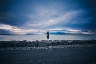 Keywords: person female woman girl young standing stones wall looking far horizon sea water lake coast shore view lookout street roadside weather grey clouds