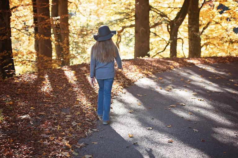 Keywords: person human away autumn walk leaves fall foliage fall leaves nature hat long hair go go along sunshine light and shadow