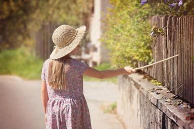 Keywords: person human child girl dress hat summer away wall wood fence fence floor wood stock along strip nature out childhood close
