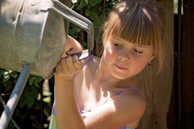 Keywords: person human child girl face watering can casting garden nature out portrait close