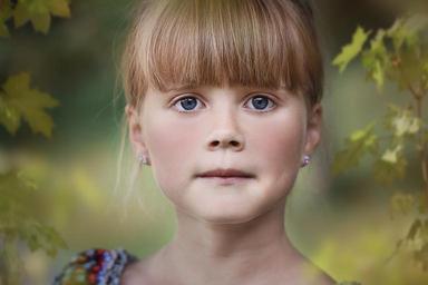 Keywords: person human child girl face view blond out nature green portrait close