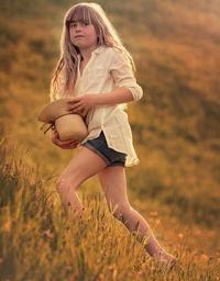 Keywords: person human child girl blond hat meadow nature out lighting portrait close