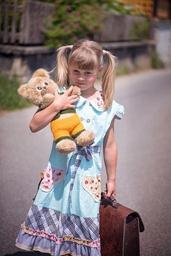 Keywords: person human child girl schulweg teddy teddy bear schoolbag leather case away road out portrait