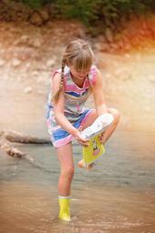 Keywords: person human child girl water bach rubber boots pour out wet nature out experience feel nature portrait