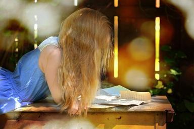Keywords: person human female girl long hair letters read garden nature portrait