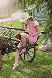 Keywords: person human female girl hat book read relax out nature summer portrait