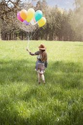 Keywords: person human female girl long hair hat balloons out nature meadow green