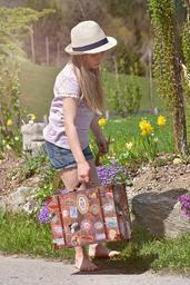 Keywords: person human girl female child hat barefoot luggage nature out portrait