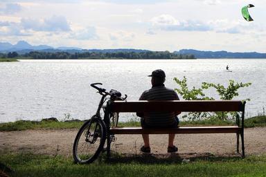 Keywords: person man bench bank lake waters individually alone look click rest human