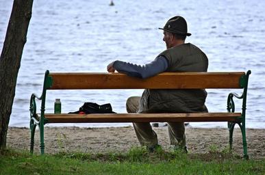 Keywords: person man individually sit bank bench rest look recover water lake human
