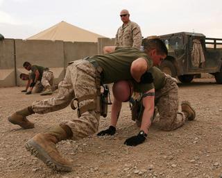 | Keywords: Personal Security Detail Marines Stay Sharp With Regular Training DVIDS263230.jpg en Gunnery Sgt Jeremy Gohl team leader for the Combat Logistics Battalion 6 Personal Security Detail supervises his Marines as they practice ground fighting techniques Feb 6 The detail is comprised of members pulled from several occupational fields; including military police and motor transport operators and provides armed security for the battalion commander 2010-02-06 Sgt Justin Shemanski https //www dvidshub net/image/263230 263230 2010-03-26 06 28 CAMP LEATHERNECK AF PD-USGov Camp Leatherneck Images from DoD uploaded by Fæ |