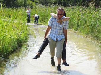 Keywords: personal self help man woman bear piggyback water flooding flood high water