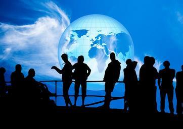 Keywords: personal silhouettes globe earth world continents africa europe asia human woman man group shadow shadow play people together community team entertainment discussion talk railing background viewing