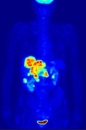 | Keywords: PET-MIPS anim frame.PNG en Maximum Intensity Projection MIP of a wholebody positron emission tomography PET acquisition of a 79 kg weighting female after intravenous injection of 371 MBq of <sup>18</sup>F-FDG one hour prior measurement The investigation has been performed as part of a tumor diagnosis prior to applying a radiotherapy tumor staging step Besides normal accumulation of the tracer in the heart bladder kidneys and brain liver metastases of a colorectal tumor are clearly visible within the abdominal region of the image de Maximumintensitätsprojektion MIP einer Ganzkörperaufnahme mittels Positronen-Emissions-Tomographie PET Die Aufnahme zeigt eine 79 kg schwere weibliche Patientin nach intravenöser Injektion von 371 MBq <sup>18</sup>F-FDG eine Stunde vor Messung Die Untersuchung wurde im Rahmen einer Tumordiagnose vor Anwendung einer Strahlentherapie sogn Tumorstaging durchgeführt Neben den normalen Anreicherungen des Tracers in Herz Blase Nieren und Gehirn sind auch Lebermetastasen eines kolorektalen Tumor im abdominalen Bereich der Aufnahme auszumachen fr Projection d'intensité maximale MIP d'un corps entier par topographie à émission de positons TEP d'une femme de 79 kg après une injection intraveineuse de 371 MBq de <sup>18</sup>F-FDG une heure avant la mesure L'étude a été réalisée lors d'un diagnostic de tumeur avant d'appliquer une radiothérapie étape tumeur Outre l'accumulation normale du traceur dans le cœur la vessie des reins et du cerveau des métastases hépatiques d'une tumeur colorectale sont clairement visibles dans la région abdominale de l'image PET-MIPS-anim gif 2006-05-22 Jens Langner http //www jens-langner de/ Damato Positron emission tomography |