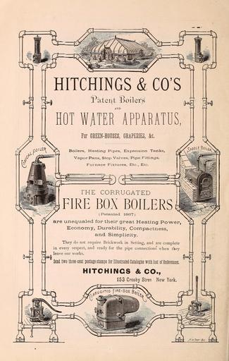 | Keywords: Peter Henderson's spring catalogue of new, rare, and beautiful plants, for 1875 (17067845631).jpg / <br> 0ILE \ <br> HITCHINGS CO'S <br> Patent Soiled <br> HOT WATER APPARATUS <br> For GREEN-HOUSES GRAPERIES fcc <br> <br> Boilers Heating Pipes Expansion Tanks <br> Vapor Pans Stop Valves Pipe Fittings <br> Furnace Fixtures Etc Etc <br> THE CORRUGATED <br> FIRE BOX BOILERS <br> Patented 1867 <br> are unequaled for their great Heating Powei <br> Economy Durability Compactness <br> and Simplicity <br> They do not require Brickwork in Setting and are complete <br> in every respect and ready for the pipe connections when they <br> rks <br> cent postage stamps for Illustrated Catalogue wim list of References <br> HITCHINGS CO <br> 153 Crosby Stree New York <br> Boi <br> B pUGATE -BOXBo f <br> J-f wTftoY-dn 42270375 133417 66378 Text http //www biodiversitylibrary org/page/42270375 1875 10 5962/bhl title 66378 Henry G Gilbert Nursery and Seed Trade Catalog Collection ; Peter Henderson Co Biodiversity Heritage Library Peter Henderson's spring catalogue of new rare and beautiful plants for 1875 greenhouses at Jeresy City Heights N J Post office address at seed store no 35 Cortlandt Street New York Catalogs Plants Ornamental Seed industry and trade Trade catalogs U S Department of Agriculture National Agricultural Library bhl page 42270375 dc identifier http //biodiversitylibrary org/page/42270375 bhlGardenStories plants ornamental u s department of agriculture national agricultural library bhlgardenstories Information field Flickr posted date ISOdate 2015-04-07 CC-BY-2 0 BioDivLibrary https //flickr com/photos/61021753 N02/17067845631 2015-08-23 20 54 41 cc-by-2 0 PD-old-70-1923 Peter Henderson's spring catalogue of new rare and beautiful plants for 1875 Photos uploaded from Flickr by Fæ using a script |