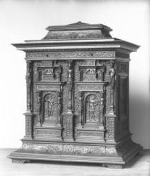| Keywords: Peter Opel - Cabinet with Scenes from the Life of David - Walters 655.jpg This cabinet with its 17 compartments some hidden is a marvel of woodcarving and a celebration of intricacy Architectural elements and ornamental detailing frame narrative compositions organized into a lattice of ordered compartments Forty-eight scenes relate the Old Testament story of David prophet and king as a model of virtue The vigor of these compositions points to their derivation from woodcut designs by a master such as Joost Amman 1539-1591 but the source is unidentified The significance of each scene is distilled by a Latin motto for example the death of David inside of the right-hand door by PIETATIS DEFUNCTIO a pious death The artist Peter Opel of Regensburg proudly inscribed his name on the door to the central compartment and on the back carved his self-portrait dressed as a gentleman but holding a chisel The chest was designed to hold small treasures and antiquities ca 1580 1590 Renaissance carved pine boxwood cm 72 57 6 accession number 65 5 37703 Arnold Seligmann Rey and Co New York date and mode of acquisition unknown Henry Walters city Baltimore Walters Art Museum Henry Walters Acquired by Henry Walters 1915 Signature; Transcription PIETATIS DEFUNCTIO; Translation a pious death World of Wonder The Walters Art Gallery Baltimore 1971-1972 Highlights from the Collection The Walters Art Gallery Baltimore 1998-2001 place of origin Regensburg Germany Walters Art Museum license Renaissance applied arts in the Walters Art Museum Furniture in the Walters Art Museum Peter Opel 16th-century way of life preserved artefacts |