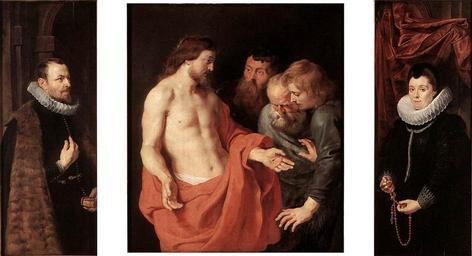 | Keywords: Peter Paul Rubens - The Incredulity of St Thomas - WGA20193.jpg Artwork Q3797799 Creator Peter Paul Rubens between 1613 1615 Oil wood size cm 143 123 central panel Institution Koninklijk Museum voor Schone Kunsten Antwerpen object history credit line accession number WGA link 20193 http //www wga hu/art/r/rubens/10religi/12religi jpg http //www wga hu/html/r/rubens/10religi/12religi html PD-old-100 painting religious Flemish 1601-1650 Paintings of New Testament by Rubens 1613 Doubtful Thomas Family portraits by Peter Paul Rubens 1613 Doubtful Thomas Paintings by Peter Paul Rubens in the Koninklijk Museum voor Schone Kunsten Rubens Baroque religious paintings WGA form painting WGA type religious WGA School Flemish WGA time period 1601-1650 Male fur clothing in art Paintings by Peter Paul Rubens with fur 1610s paintings in the Netherlands 17th-century religious paintings in the Netherlands Paintings of Saint Thomas Paintings of Doubting Saint Thomas Red textiles in art Fur pieces Triptychs in Belgium Donor portraits with Jesus Christ |