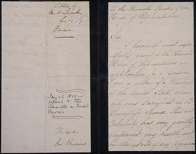 | Keywords: center for legislative archives centerforlegislativearchives u.s. national archives usnationalarchives nara:arcid=306682 text writing document architecture abstract Original Caption: Petition of Mary Todd Lincoln requesting a pension, 01/26/1869 Created By: U.S. House of Representatives. Committee on Invalid Pensions. (01/10/1831 - 1946) From: Record Group/Collection: 233 From: Petitions and Memorials, compiled 1831 - 1927 Production Dates: 01/26/1869 Persistent URL: arcweb.archives.gov/arc/action/ExternalIdSearch?id=306682 Reference Unit: Center for Legislative Archives (NWL), National Archives Building Access Restrictions: Unrestricted Use Restrictions: Unrestricted Original Caption: Petition of Mary Todd Lincoln requesting a pension, 01/26/1869 Created By: U.S. House of Representatives. Committee on Invalid Pensions. (01/10/1831 - 1946) From: Record Group/Collection: 233 From: Petitions and Memorials, compiled 1831 - 1927 Production Dates: 01/26/1869 Persistent URL: arcweb.archives.gov/arc/action/ExternalIdSearch?id=306682 Reference Unit: Center for Legislative Archives (NWL), National Archives Building Access Restrictions: Unrestricted Use Restrictions: Unrestricted |