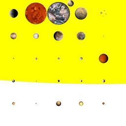 | Keywords: Petits corps (1 px = 100 km).jpg Portrait of the 29 small bodies of the solar system of 400+ km diameter at the scale 1 px 100 km Are excluded the gas giants and the numerous trans-neptunian objects other than Pluto and Charon of sizable dimension From left to right and top to bottom 1st row Mercury Venus the Earth and the Moon Mars the four main belt asteroids of 400+ km size 1 Ceres 2 Pallas 4 Vesta and 10 Hygiea 2nd row Io Europa Ganymede Callisto Mimas 3rd row Enceladus Tethys Dione Rhea Titan 4th row Iapetus Miranda Ariel Umbriel Titania 5th row Oberon Proteus Triton Pluto and Charon By coincidence the spacing between the objects matches closely the Pluto-Charon distance The curve of the Sun's limb is in the background badJPEG Source english wikipedia<br /> Author en User Urhixidur realised this image using http //nssdc gsfc nasa gov/ NSSDC National Space Science Data Center images and hereby donate it to the public domain en English Wikipedia Urhixidur Sun size comparisons Mercury size comparisons Terrestrial Planet Earth size comparisons Moon size comparisons Mars size comparisons Solar System object comparisons Venus size comparisons |