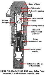 | Keywords: Peuch-Remondy 24 31 Mod 1916 Fuze.jpg Fusée 24/31 Mod 1916 Peuch-Remondy Fusée-détonateur percutante de 24/31 modèle P R 1916 <br> Cette fusée équipait principalement les projectiles des Mortiers de tranchée du calibre 58 mm au calibre 240 mm Percussion fuse / detonator model P R 1916 <br>Cross-section view Variation designed by Capitaine Rémondy for use with trench mortar bombs which were difficult to safely arm due to having low acceleration and no spin The fuses also needed to safely withstand poor trench conditions and rough handling <br>It was used with 240 mm and 58 mm Trench Mortar bombs 24 indicated thread in mm 31 indicated cone base in mm See also 240 mm 9 45 inch Trench Mortar Bomb March 1918 Bomb component names and dimensions December 1917 240 mm Trench Mortar 58 mm Trench Mortar http //www passioncompassion1418 com/decouvertes/english_fusees_collection_fr html 2431MODpr1916 Fusée 24/31 Mod 1916 Peuch-Remondy external link with photographs and details Cross-section view of of 24/31 P R Peuch-Remondy Model 1916 1/10 second delay action fuse in unarmed state for 240 mm Trench Mortar bomb and 58 mm Trench Mortar bomb Based on Figure 9 in Manual for Trench Artillery Part IV 240 mm Mortar Prepared at Headquarters American Expeditionary Force France March 1918 <br>http //cgsc cdmhost com/u /p4013coll9 252 2007-09-09 Rcbutcher PD-USGov Fuzes of France 240 mm Trench Mortar Ammunition Mortier de 58 mm type 2 Ammunition Cross sections |